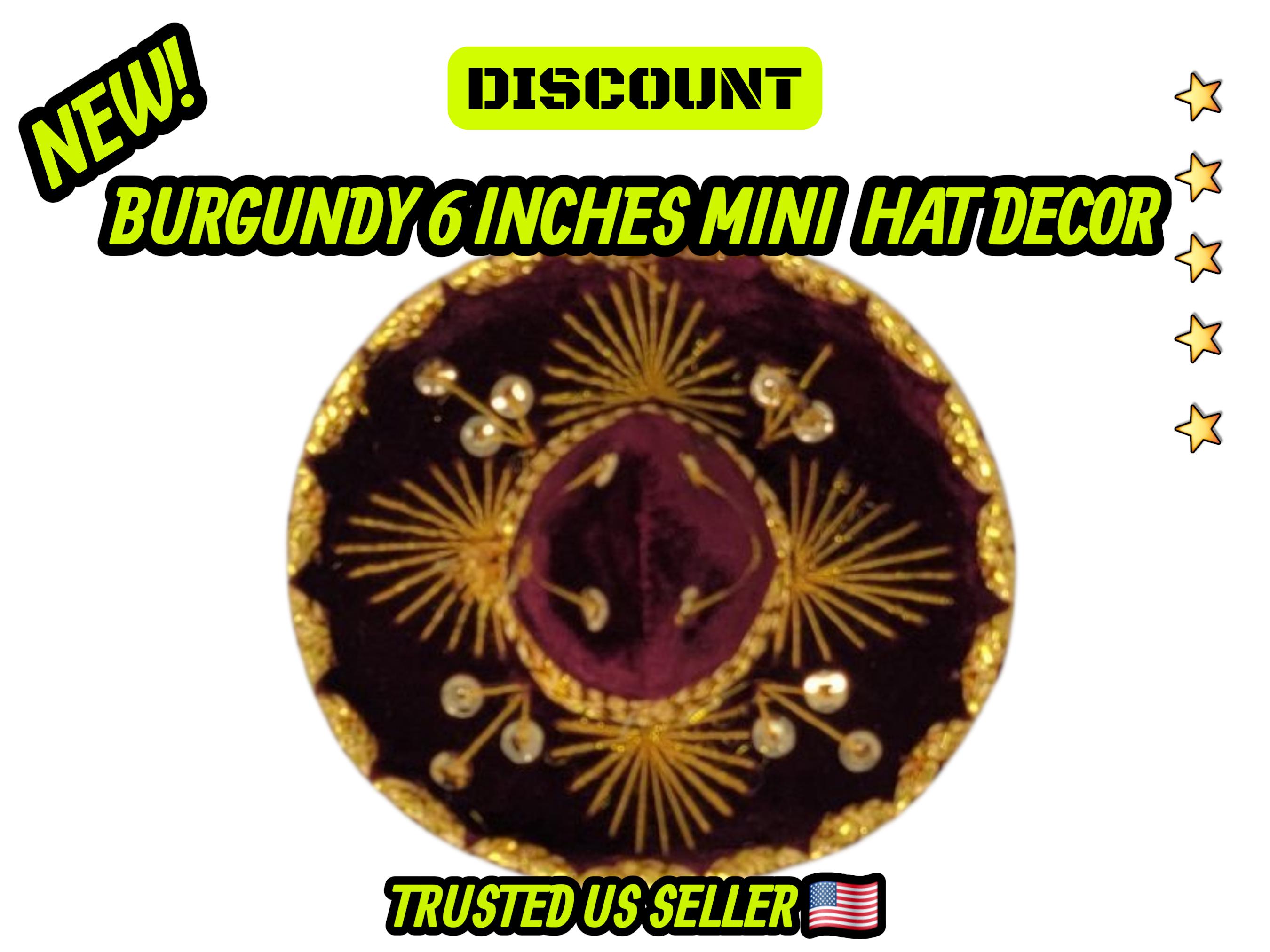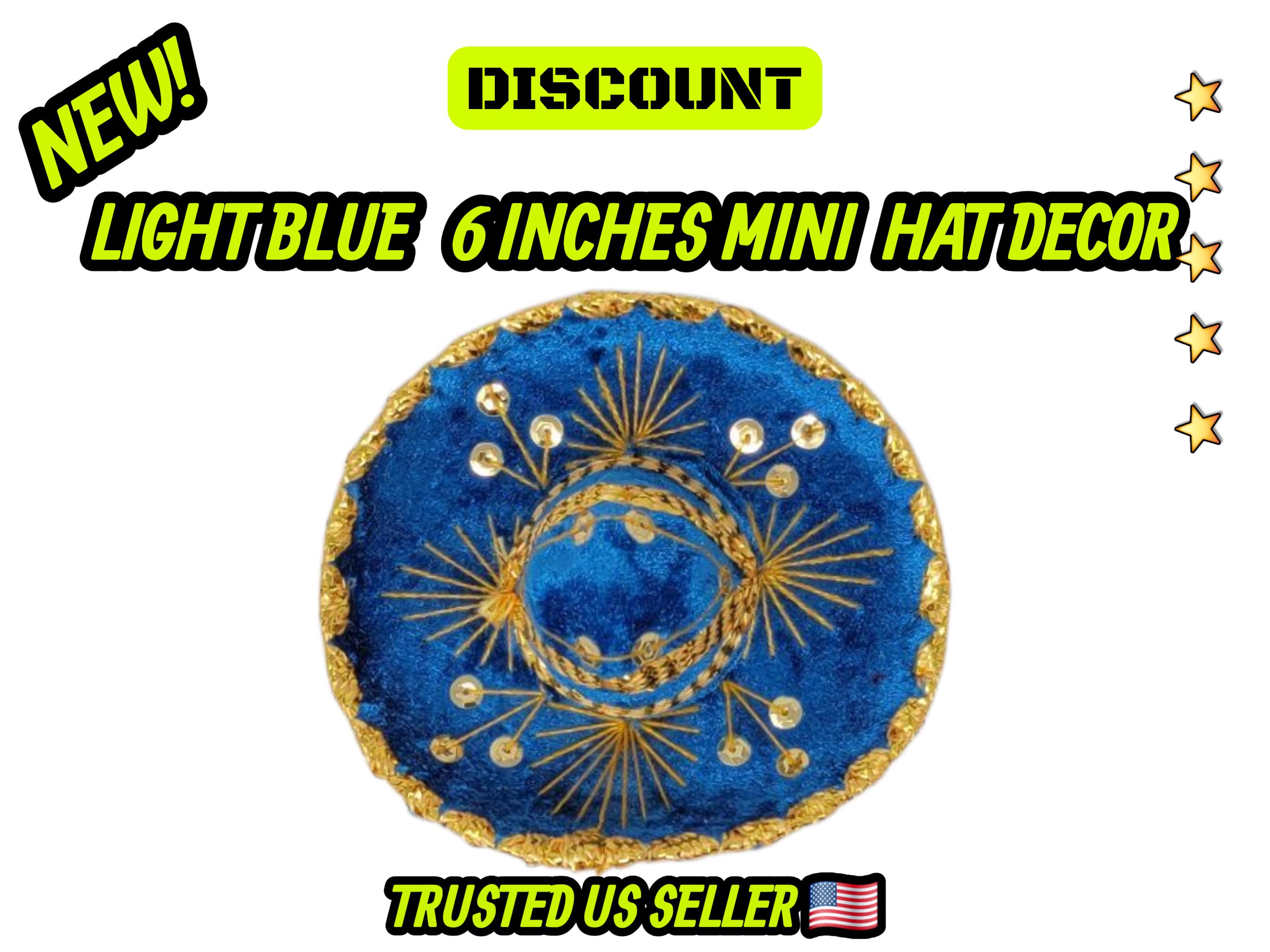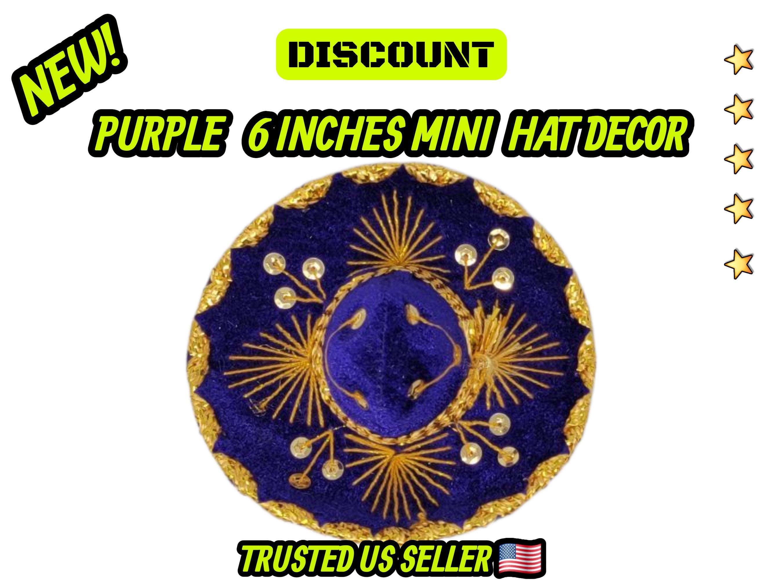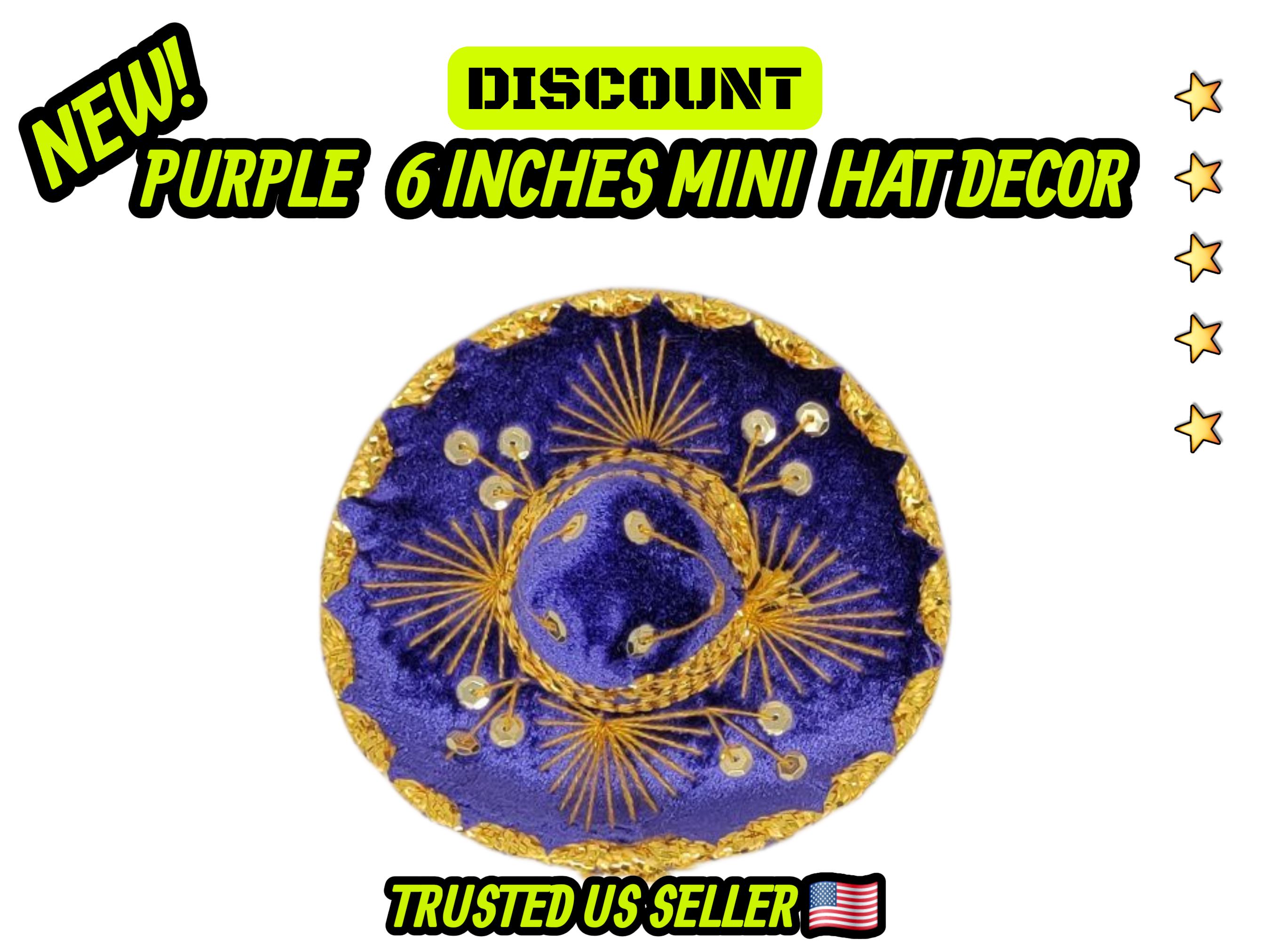 m selling 6 fiesta assorted sombreros charro hat assorted colors , these fiesta hats measures 5 inches in diameter . made in velvet and decorated with gold sequin sequence traditional mexican charro sombrero