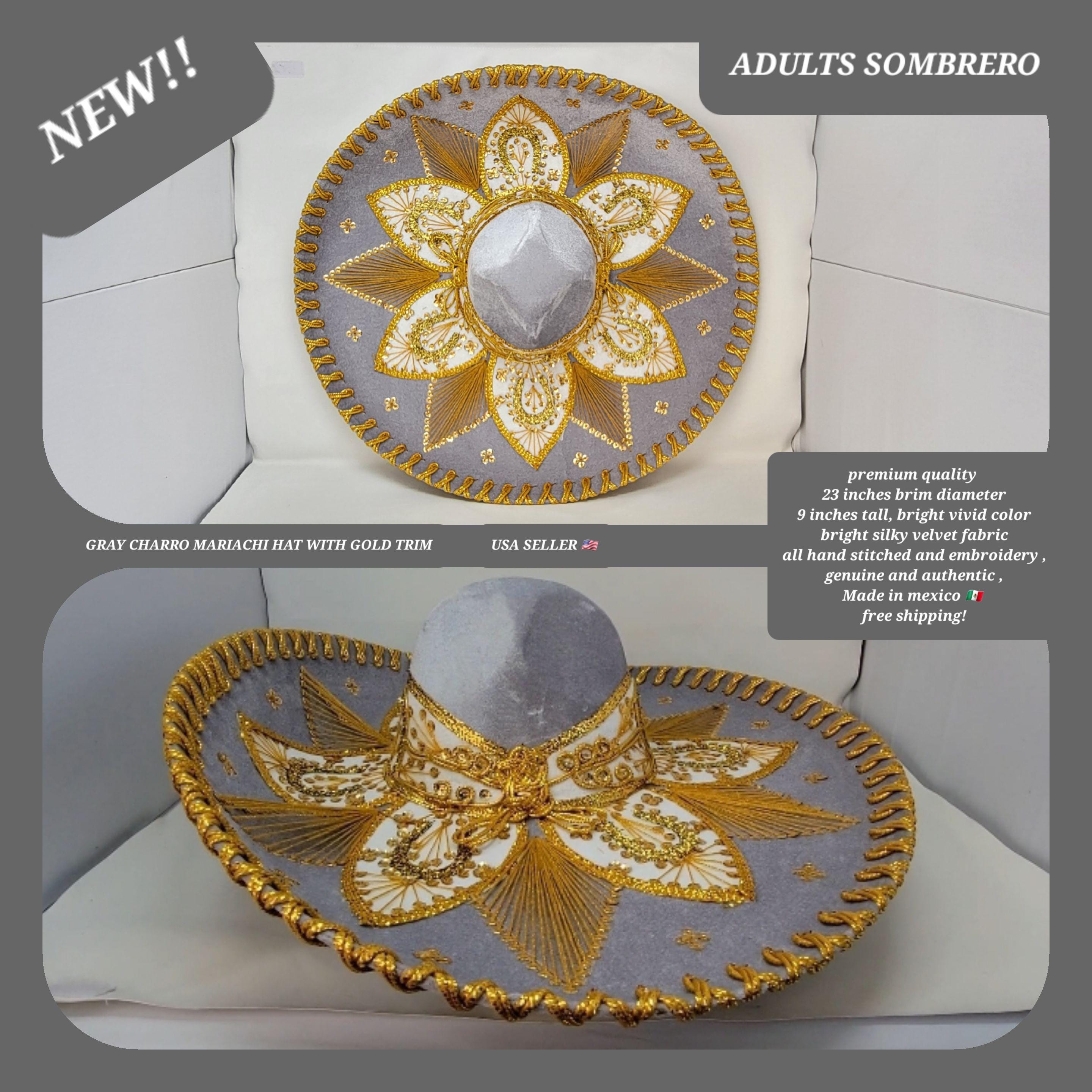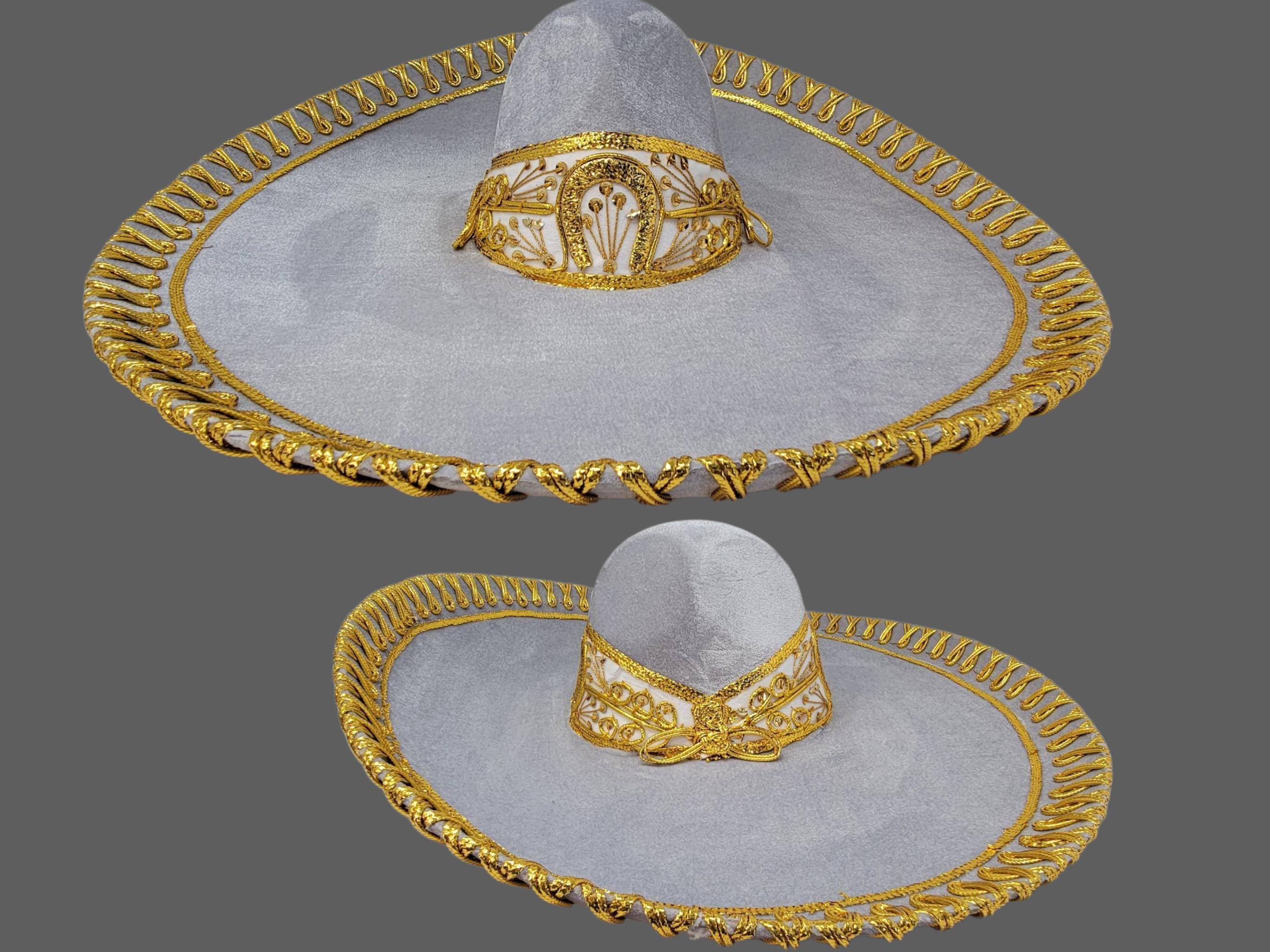 This mariachi hat is a true work of art, handcrafted with meticulous attention to detail. The hat is made of a high-quality gray velvet fabric, and the brim is adorned with a delicate band of golden trim. The crown is embellished with intricate hand-embroidered floral patterns, showcasing the skill and artistry of the artisans.