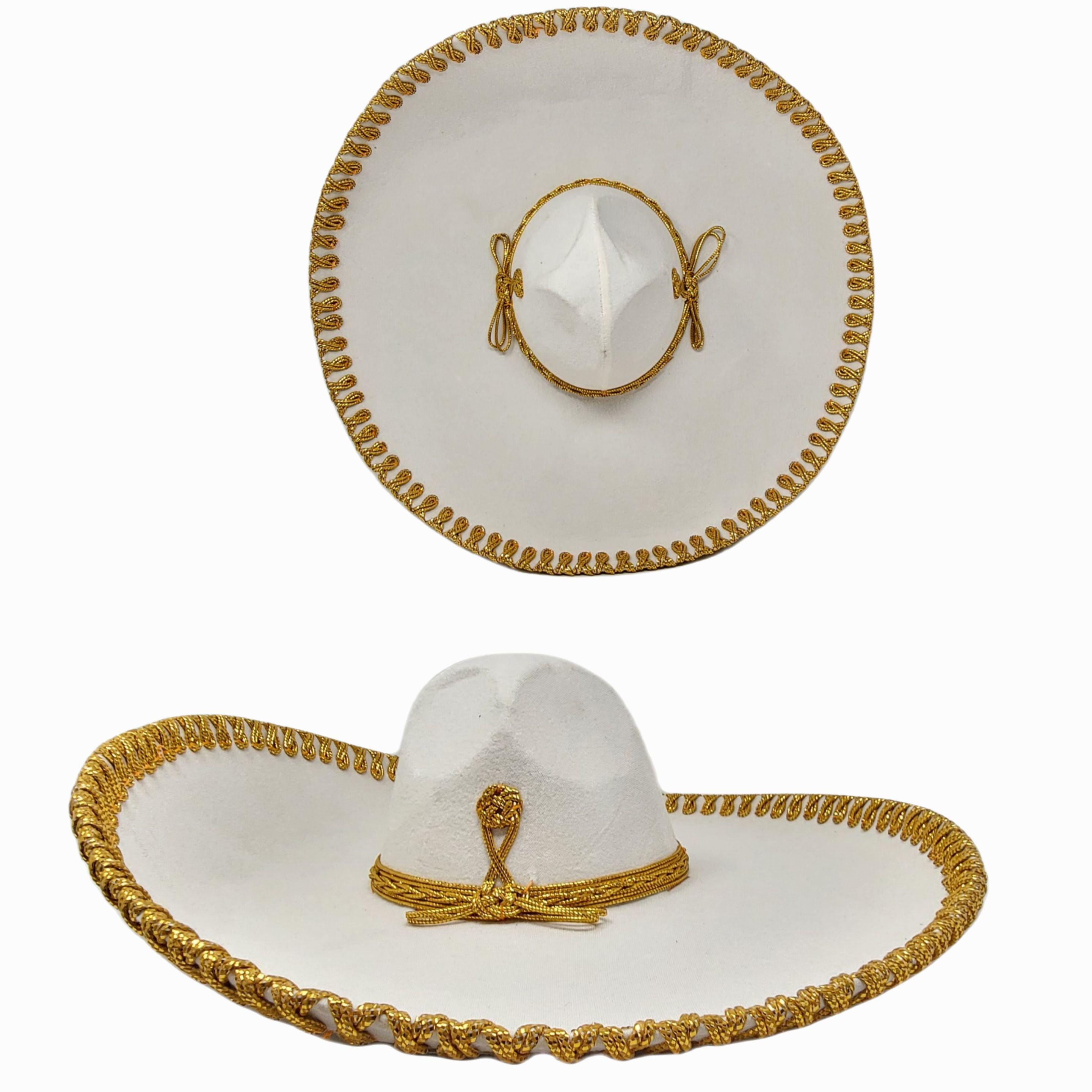 Handmade white cream Velvet Mariachi Sombrero with Golden Trim and Embroidery