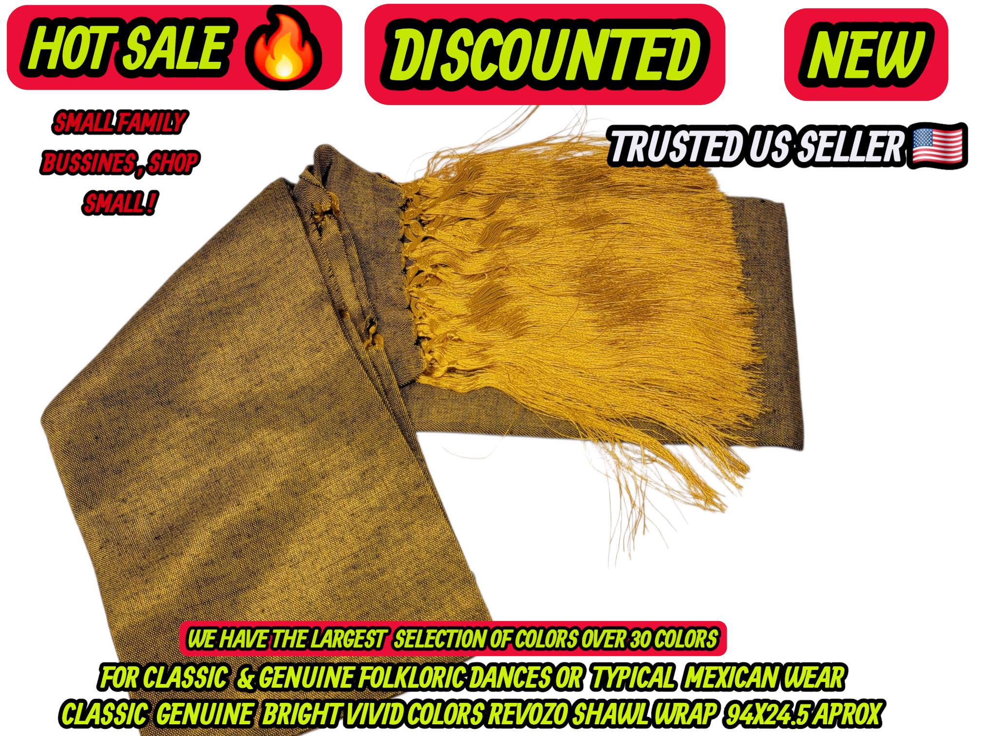 Rebozo gold color woven with black Shawl: Artisela Silk Fringed Wrap (94" x 24.5")