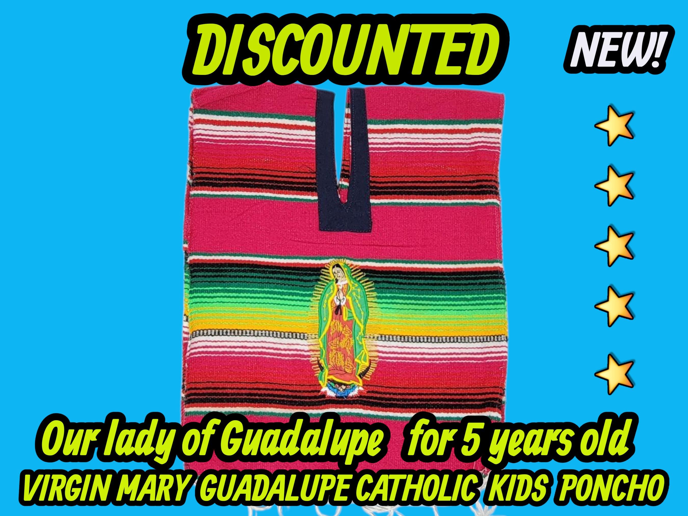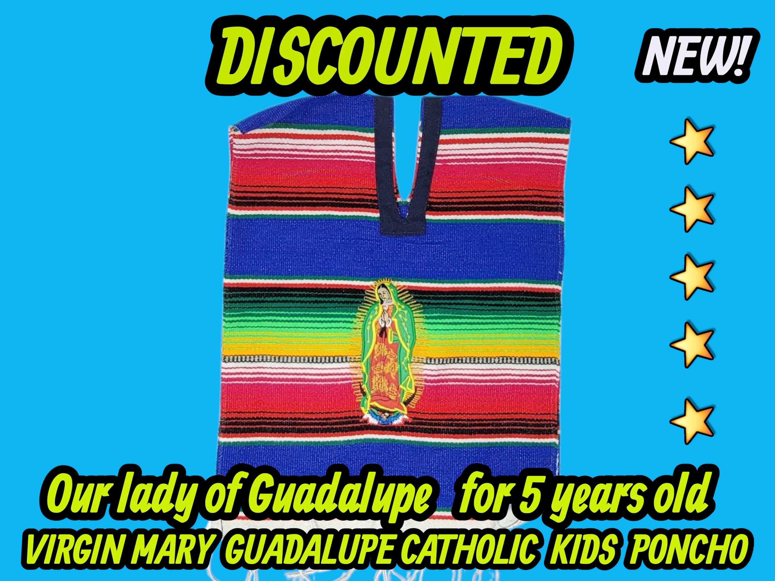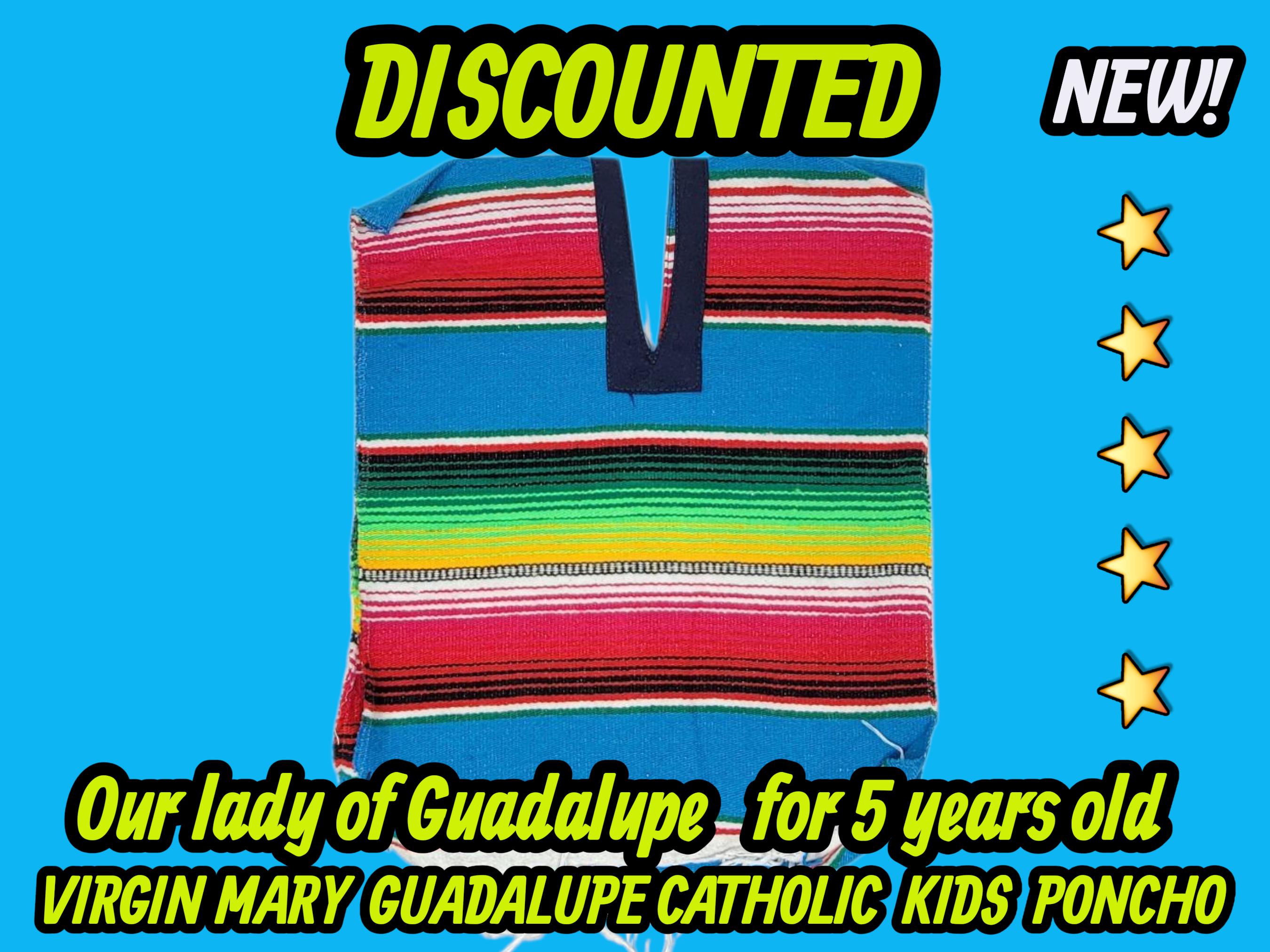 Buy this peasant poncho for kids with virgin of Guadalupe embroidery pattern with fringes