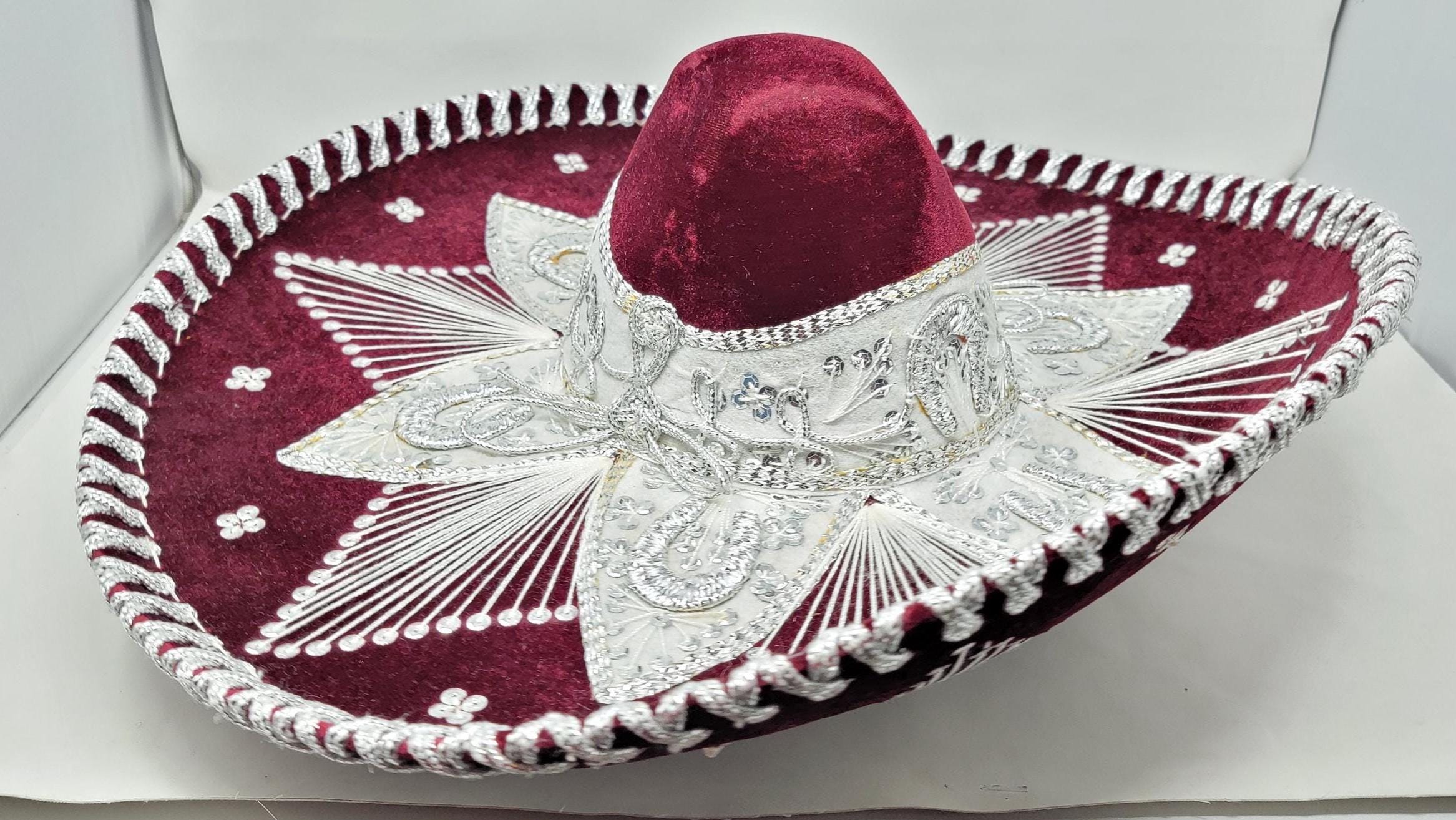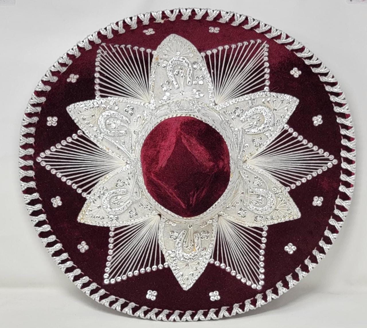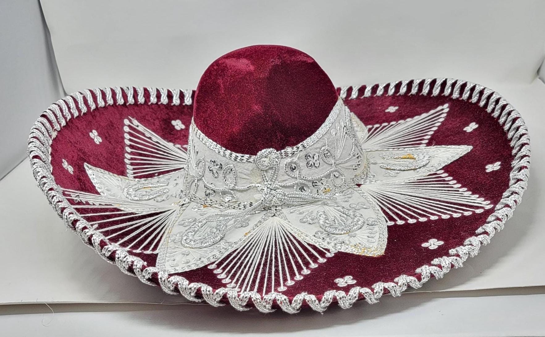 Handmade Velvet Charro Sombrero: Adult Mexican Fiesta Hat with Gold Trim burgundy